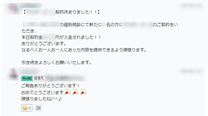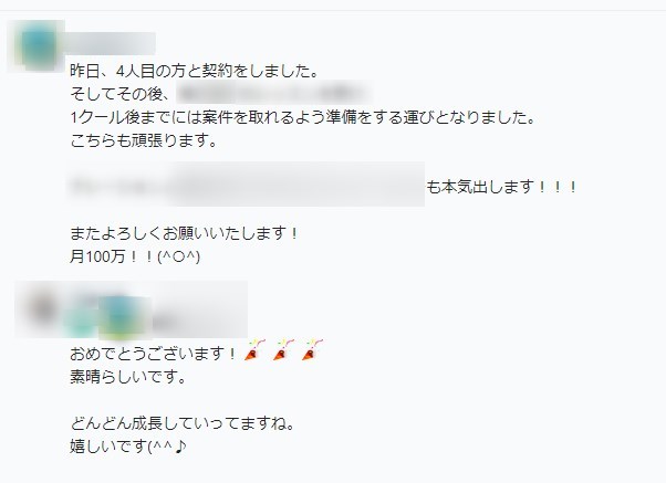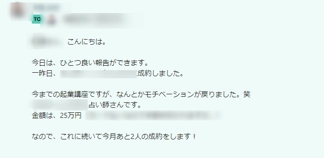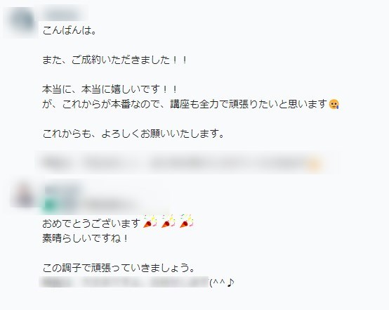 今まで他の塾のサポートで忙しくなかなか自分の成果が途絶えていました。でも、ここで一緒に学ぶことで久しぶりに成約しました!